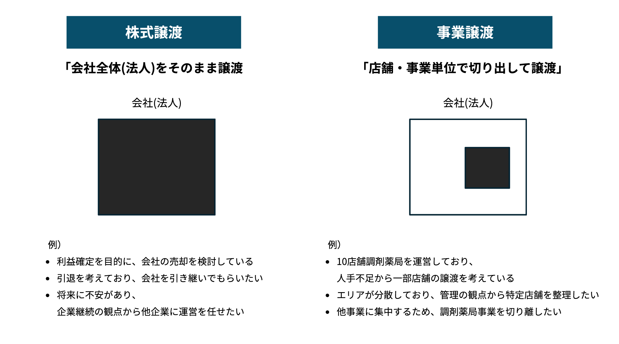 薬局の場合、特定の店舗のみを譲渡対象とし、譲受企業が新たにその薬局を運営する形となります。
